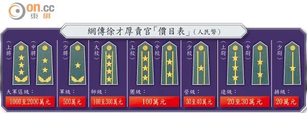 东方日报报道,,全国两会期间,一份军官「价目表」曾在网上曝光。另外,军方今年一月和本月初则分别公布了十六名和十四名军级以上军官被查,媒体指其中多人涉及向徐才厚买官。而徐才厚去年六月三十日被开除党籍并移交军事检察机关侦查,去年十月又被开除军籍和剥夺 上将军衔,成为解放军建军以来因贪腐被起诉的最高级军官。