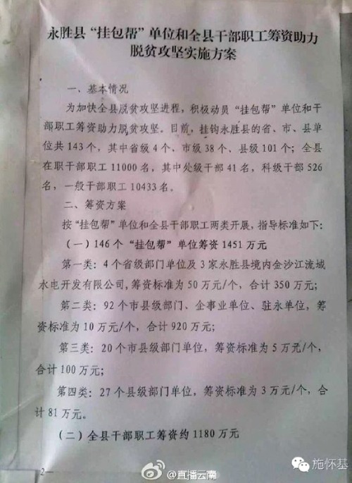 据《自由亚洲电台》报道,被列为扶贫重点的云南省丽江市永胜县政府近日下发文件,强制要求当地百姓捐款,规定捐款金额从1000元至5000元不等。当局此举引发网民批评,有评论认为,县政府的行为等同于抢钱。