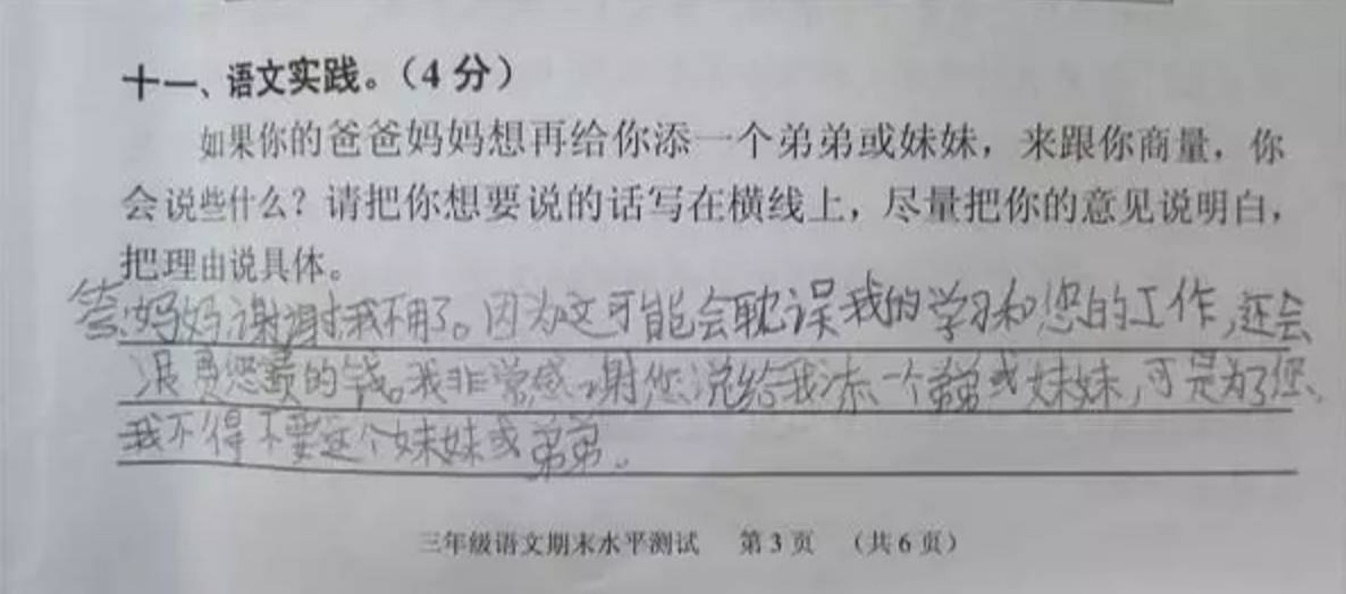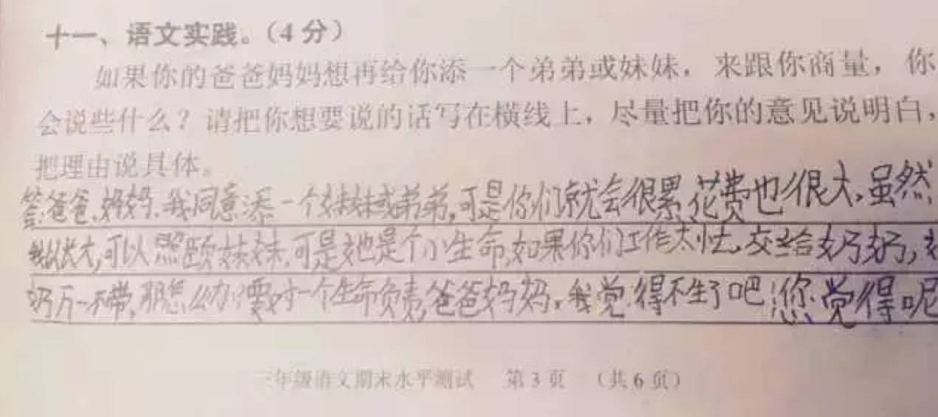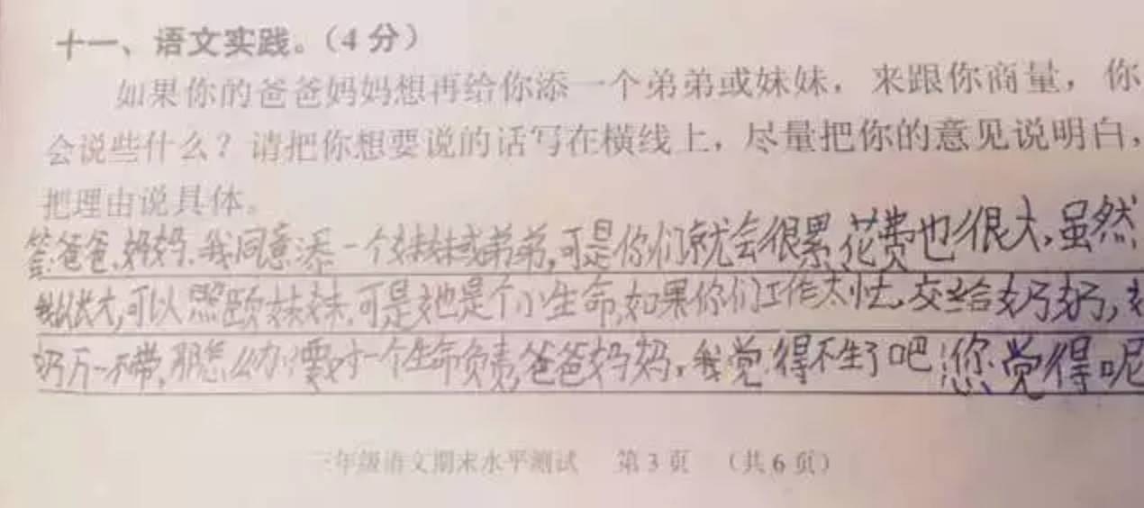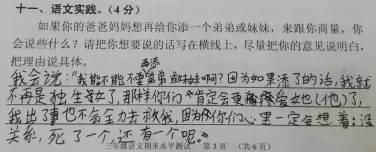 去年有网民分享广州一间小学有关第二胎的语文考试题目:“如果你的爸爸妈妈想给你再添一个弟弟或妹妹来跟你商量,你会说些什么?”有孩子坦白说:“我能不能不要再添弟弟或妹妹?因为……我出了事也不会全力去救我,因为你们心里一定会想着没关系,死了一个,还有一个呢。”
