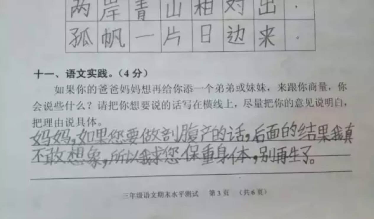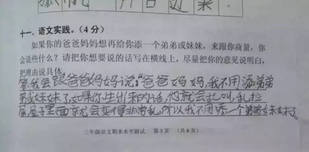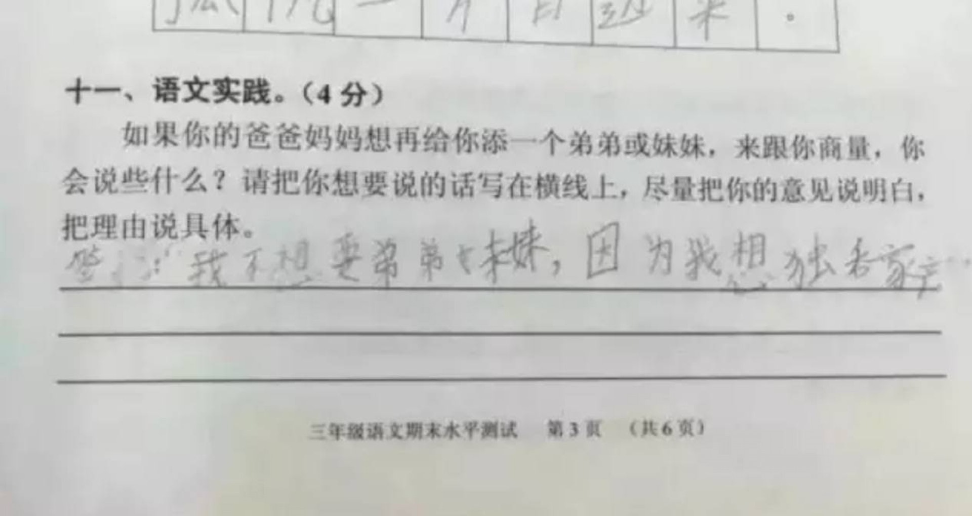 去年有网民分享广州一间小学有关第二胎的语文考试题目:“如果你的爸爸妈妈想给你再添一个弟弟或妹妹来跟你商量,你会说些什么?”有孩子坦白说:“我能不能不要再添弟弟或妹妹?因为……我出了事也不会全力去救我,因为你们心里一定会想着没关系,死了一个,还有一个呢。”