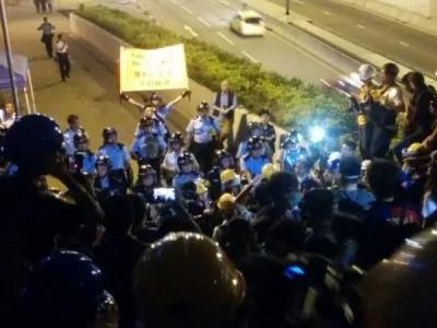 香港占中争取真普选行动面临港警不断的驱离,今日(30)香港专上学生联会(学联)和学民思潮在金钟占领区举办晚会 ,并呼吁参加者戴口罩、眼罩、头盔和雨伞等防护装备,晚间9点正式宣布,将包围政府总部,目前金钟的民众集结后正前往政总,而面对将前往政总包围的民众,港警则是举起黄旗警告。