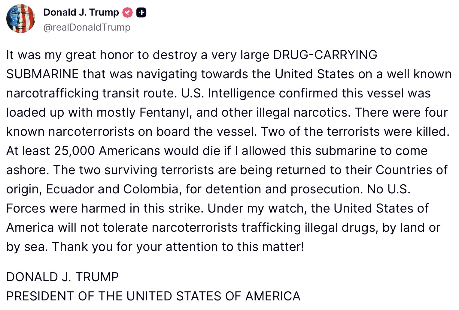 2025年10月18日,美国总统特朗普在社交平台写道:“我很荣幸地宣布,已摧毁了一艘巨大的运毒潜艇,它装满非法毒品,主要是芬太尼;经过一条广为人知的运毒航线,驶向美国......2名毒品恐怖分子被杀,2个幸存者将被遣返到厄瓜多尔和哥伦比亚。”(Truth Social截图)